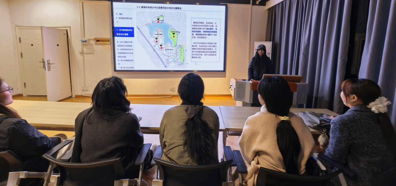 论坛现场,研究生彭力以《AIGC 赋能下湖北和美乡村景观创意设计实践与研究》为题进行分享。她聚焦湖北和美乡村建设的现实需求与文化赋能路径,创新性地将 AIGC 技术引入乡村景观创意设计领域,结合荆楚地域文化特色,从乡土元素数字化转化、景观方案快速迭代、村民参与式设计交互等维度展开研究。通过具体设计实践案例,彭力阐述了 AIGC 在优化乡村景观视觉呈现、提升设计效率、传承地域文脉等方面的应用价值,为科技赋能乡村美学建设提供了可借鉴的实践方案。