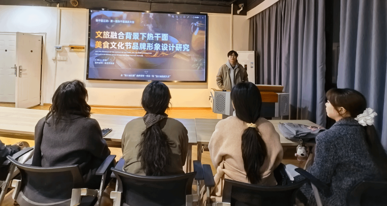 立足湖北特色美食文化资源,研究生王振带来《文旅融合背景下热干面美食文化节品牌形象设计研究》的汇报。他紧扣文旅融合发展趋势,深入挖掘热干面背后的荆楚饮食文化内涵与城市记忆符号,从品牌视觉标识系统、活动场景视觉设计、文创衍生品开发等方面进行系统性设计探索。通过构建具有辨识度与传播力的品牌形象体系,王振为美食文化节赋能城市文旅发展、提升地方美食文化影响力提供了创新设计思路。