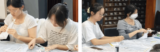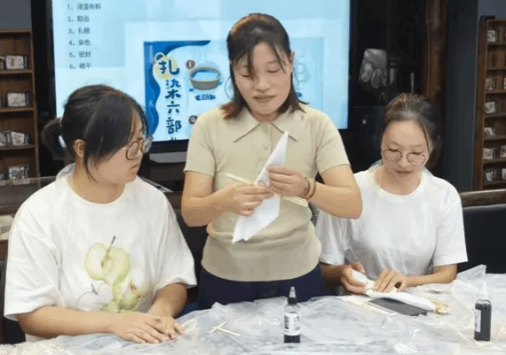 沉浸体验,蓝染新意。活动中,扎染非遗传承人详解扎染历史、技法,现场演示“捆扎”“折叠”等工艺。同学们兴致勃勃投入创作,在老师指导下,或采用皮筋、筷子创作几何纹样,或使用夹子等工具打造自然肌理,大家大胆尝试将有趣元素融入扎染创作中,在蓝白晕染间感受非遗魅力。