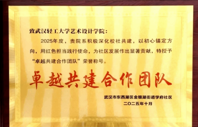 10月17日下午,在“学聚民心 文泽邻里”学府社区主题文化节活动中,艺术设计学院凭借在深化校社共建、服务社区发展中的突出表现,被武汉市东西湖区金银湖街道学府社区授予“卓越共建合作团队”荣誉称号。